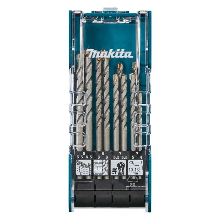 12-delige set met cilindrische opname, bestaand uit boren in de afmetingen 4x70mm – 5x85mm – 5,5x85mm (2x) – 6x100mm (2x) – 6,5x100mm (2x) – 7x100mm (2x) – 8x110mm (2x).
