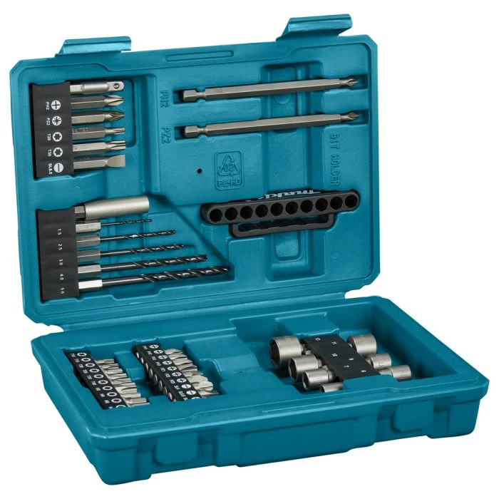 42-delige Makita boor-/schroefbitset met diverse maten metaalboren, schroefbits en doppen.