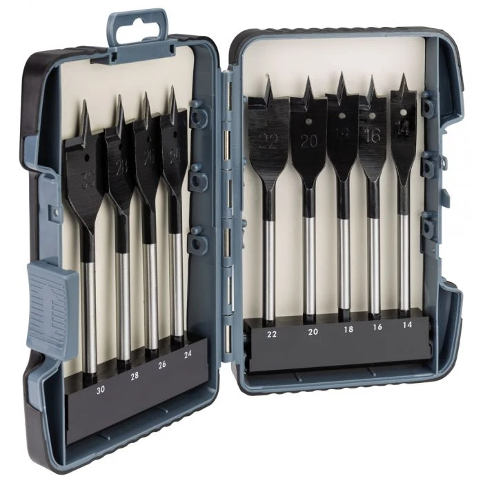 Set bestaat uit speedboren met een diameter van 14, 16, 18, 20, 22, 24, 26, 28, en 30 mm.